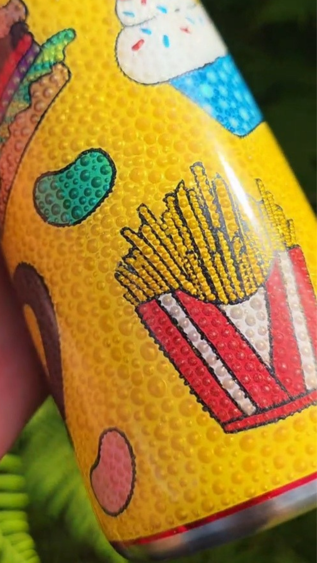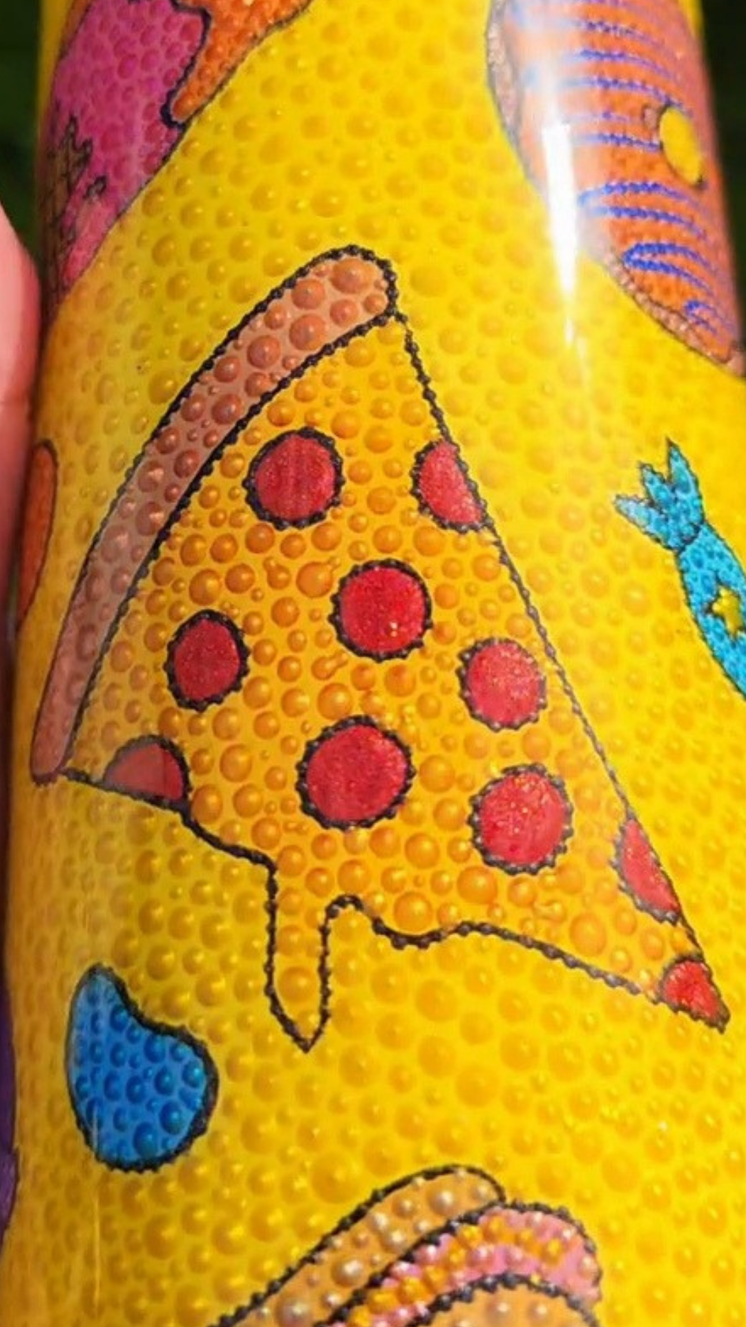 From my Twisted Dots collection, this playful design celebrates everyone’s favorite guilty pleasures. The tumbler is first hand-painted with an assortment of colorful junk foods, then finished in my signature pointillism style—each dot applied with glue and layered in pigments, glitters, and foils for incredible shine and texture. The raised dot work adds depth and dimension, making this tumbler as fun to hold as it is to see.