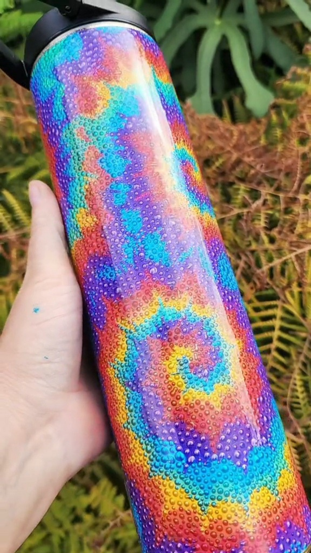 This tumbler from my Twisted Dots collection transforms the classic tie-dye look into a vibrant, textured work of art. Using a pointillism technique, each dot is carefully applied with a repositionable adhesive and layered with pigments, glitters, and foils to create a luminous, dimensional swirl. Multiple swirls are included in the design unless otherwise requested, giving each tumbler a dynamic and one-of-a-kind pattern.