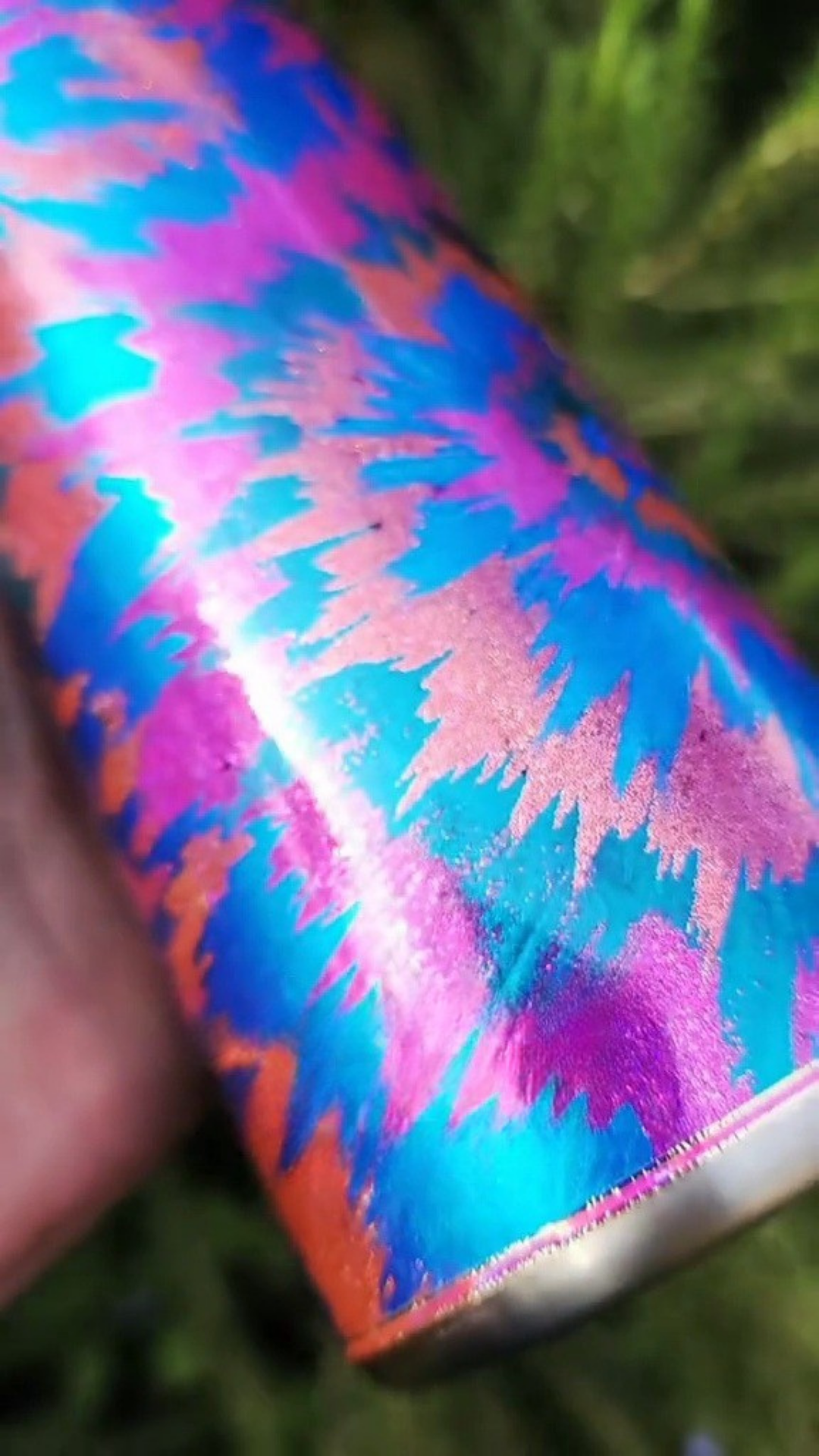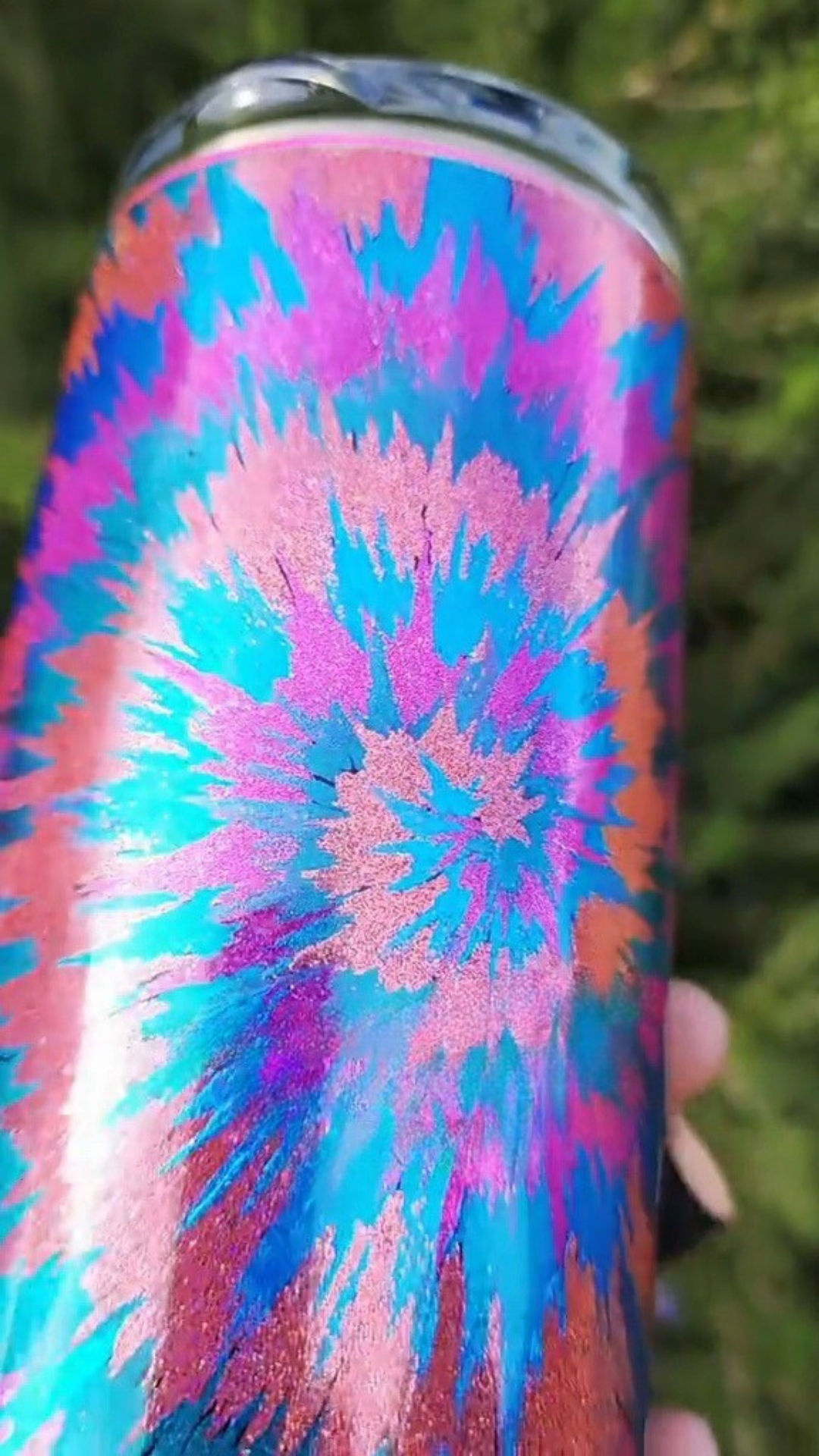 From my Twisted Impressions collection, this tumbler features abstract bursts of color swirling across the surface in a sleek, luminous finish. Created using hand-applied brush strokes with repositionable adhesive, each layer is accented with pigments, glitters, and foils for shimmering dimension. The result is a modern, one-of-a-kind interpretation of tie-dye, bold, sophisticated, and unlike anything mass-produced.