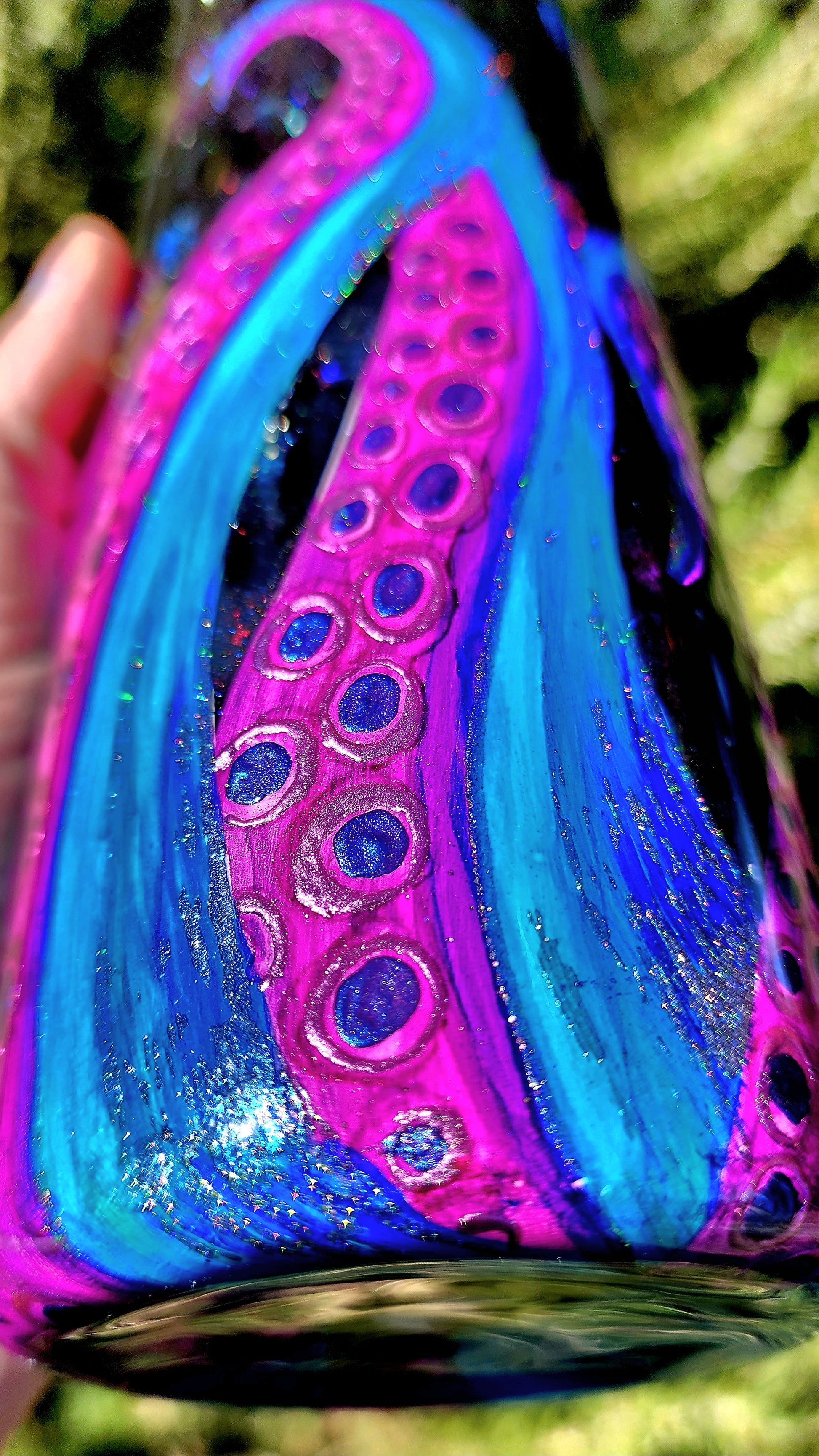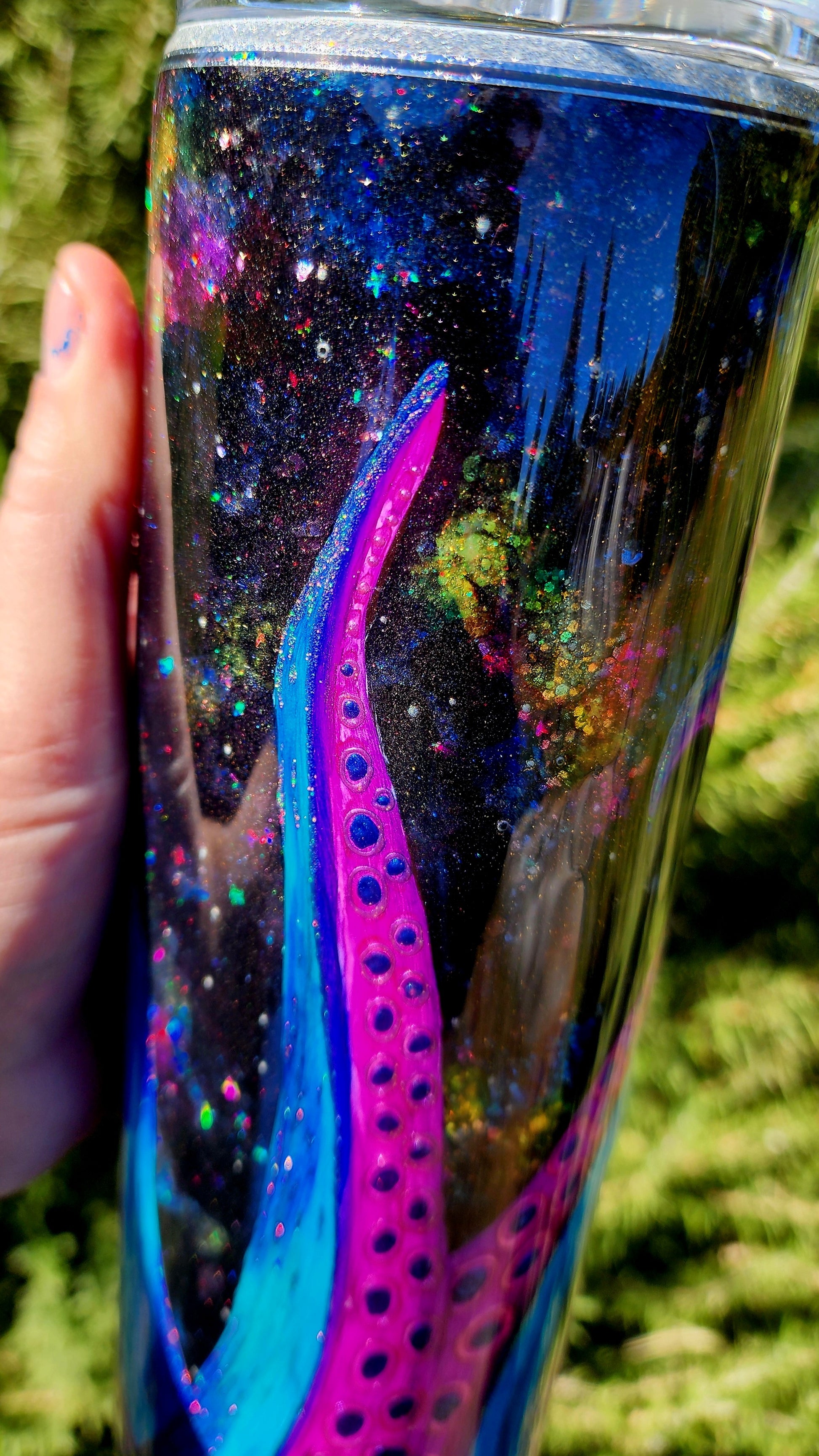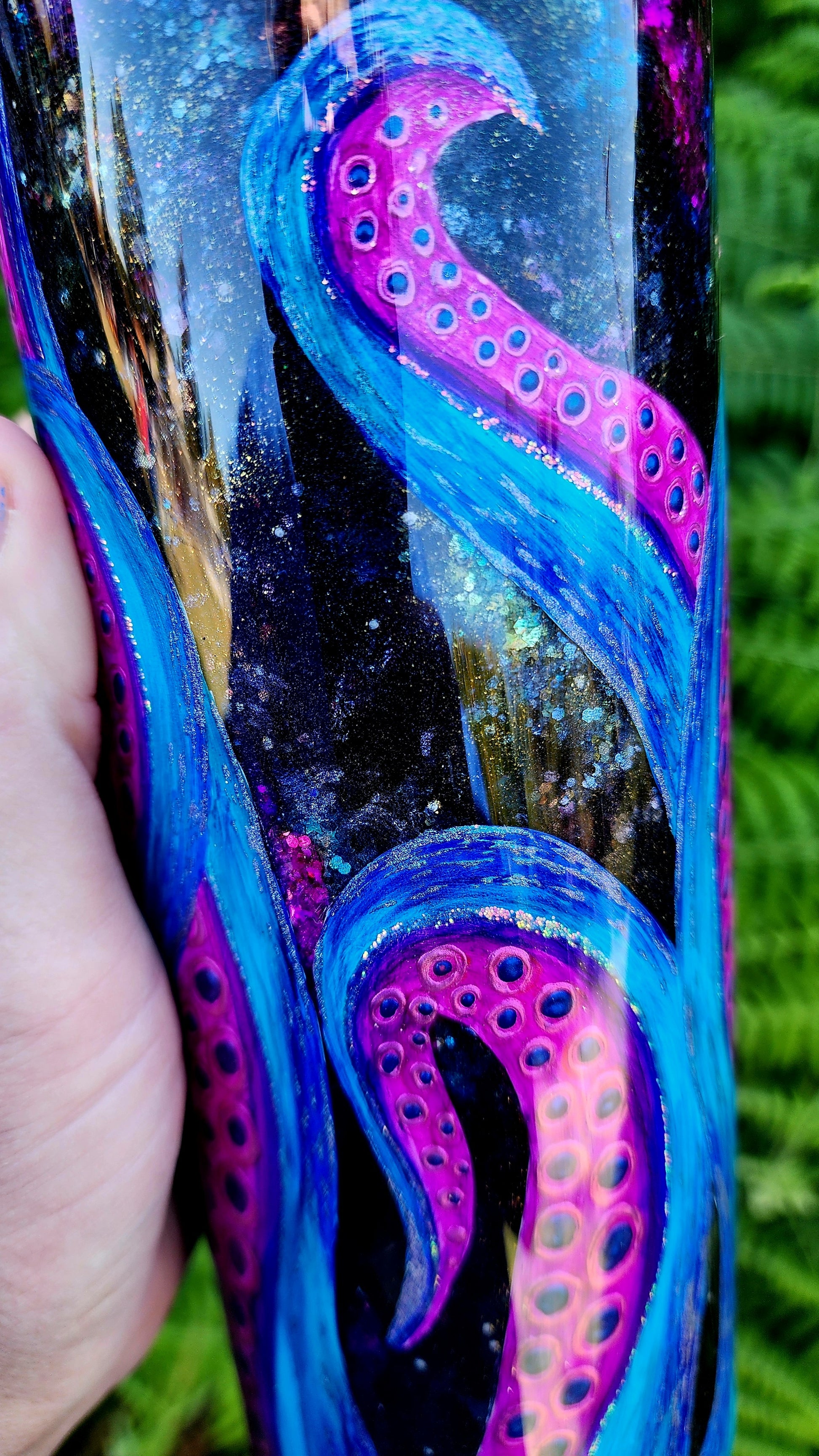 From my Twisted Ink collection, this tumbler features a dramatic Kraken design, with bold tentacles climbing from the base of the cup. Painted in alcohol inks over your choice of ocean, space-inspired, or wood plank background, the piece is rich in color and layered with shimmering details that catch the light beautifully. Each tumbler is hand-painted, ensuring every Kraken is unique.