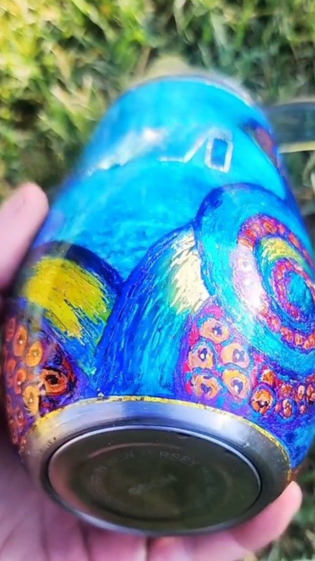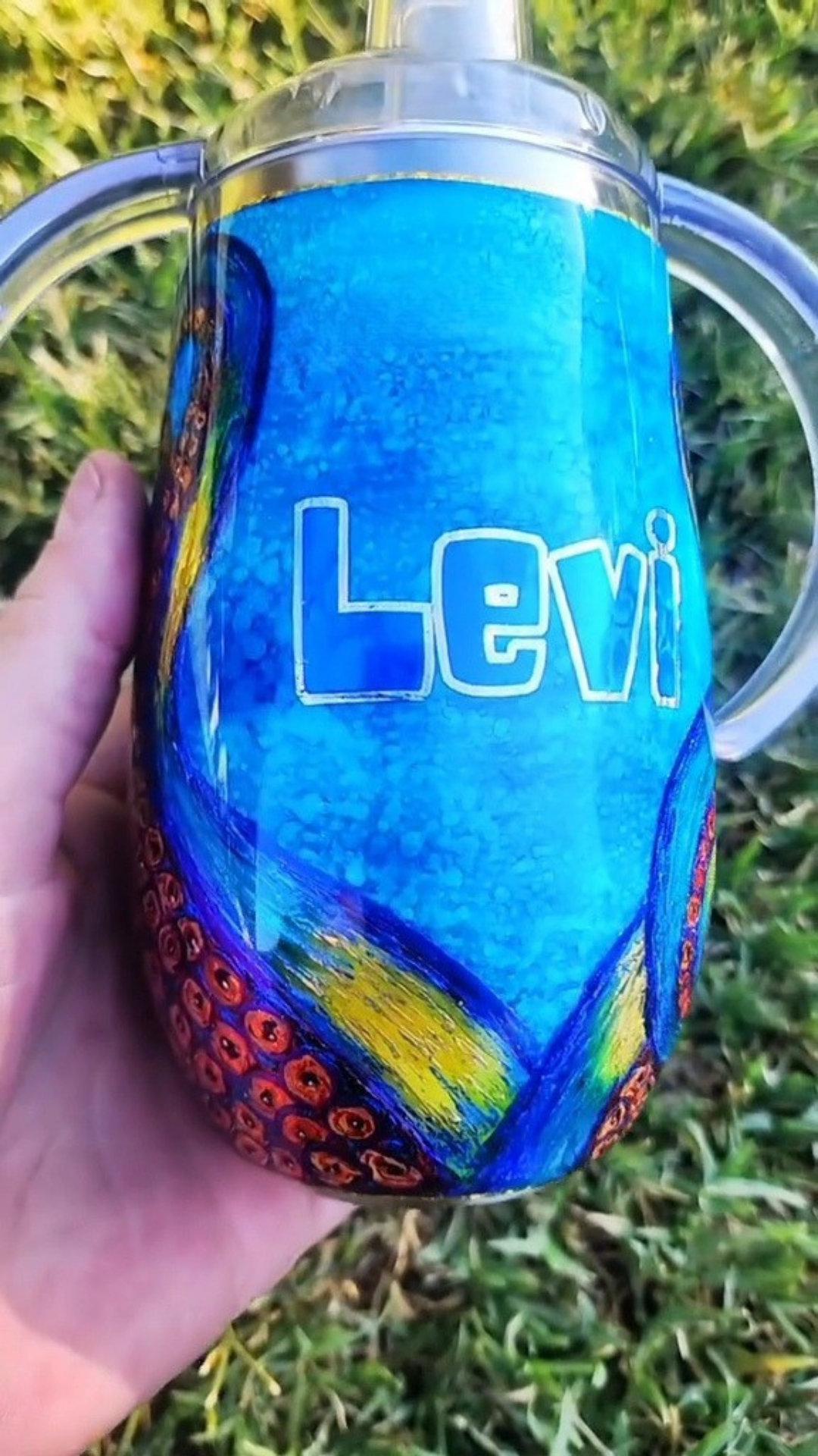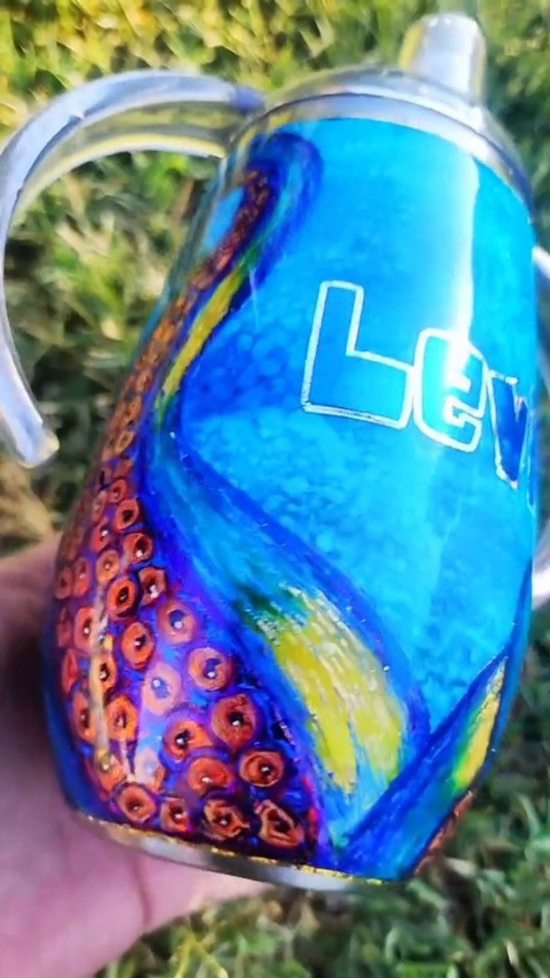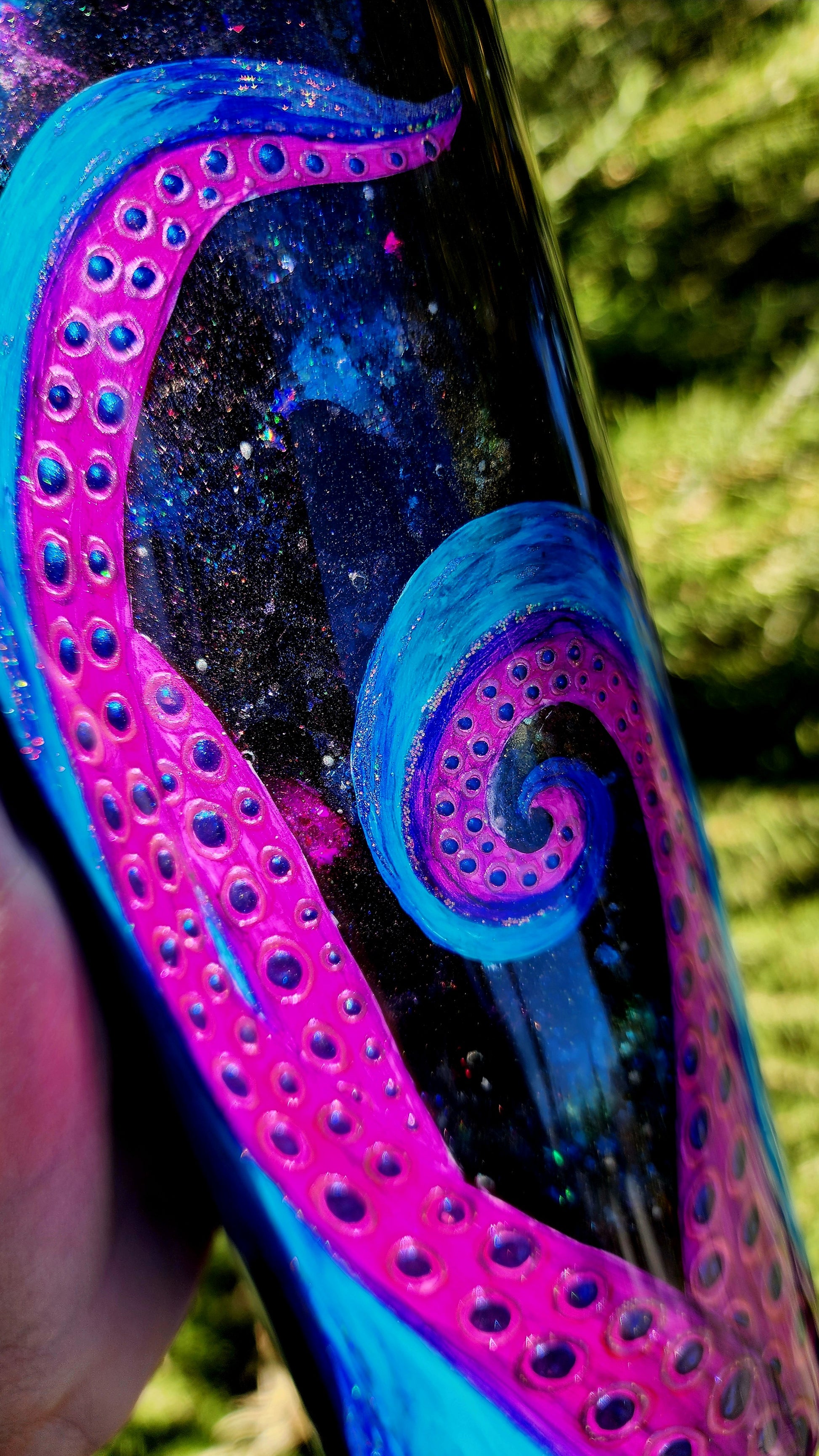 From my Twisted Ink collection, this tumbler features a dramatic Kraken design, with bold tentacles climbing from the base of the cup. Painted in alcohol inks over your choice of ocean, space-inspired, or wood plank background, the piece is rich in color and layered with shimmering details that catch the light beautifully. Each tumbler is hand-painted, ensuring every Kraken is unique.
