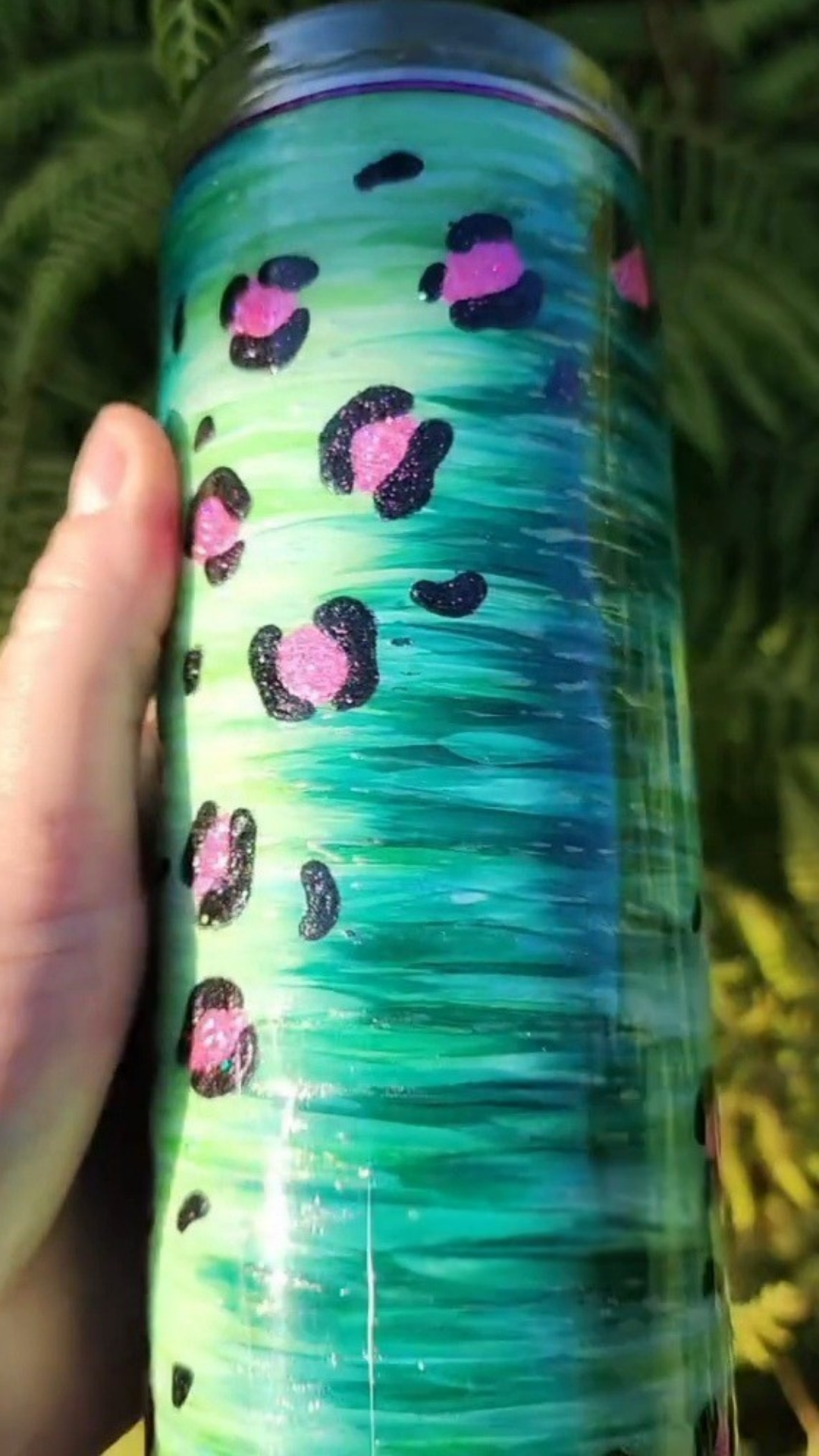 From my Twisted Ink collection, this bold design begins on a deep black base and is brought to life with layered alcohol inks. White ink is worked into each section to blend and brighten the colors, adding depth and texture. Short to medium brushstrokes spiral around the tumbler in a twisted pattern—ranging from simple two-color palettes to full, radiant rainbows. Whisps of glue are then swept across the design and finished with a dusting of ultra-fine, iridescent “fairy dust” glitter, creating a soft shimmer that shifts with the light. The result is dimensional, luminous, and unlike anything else.