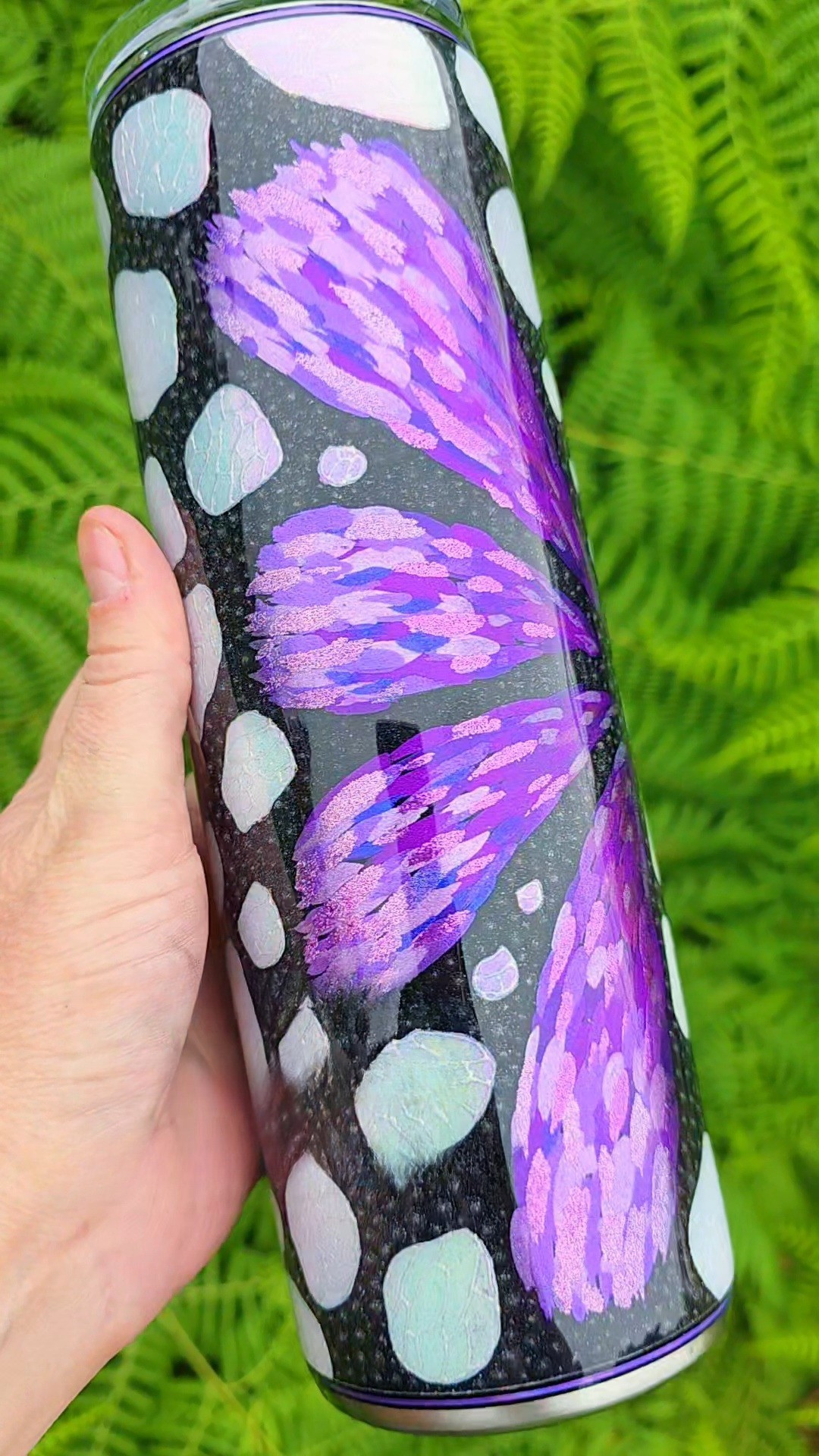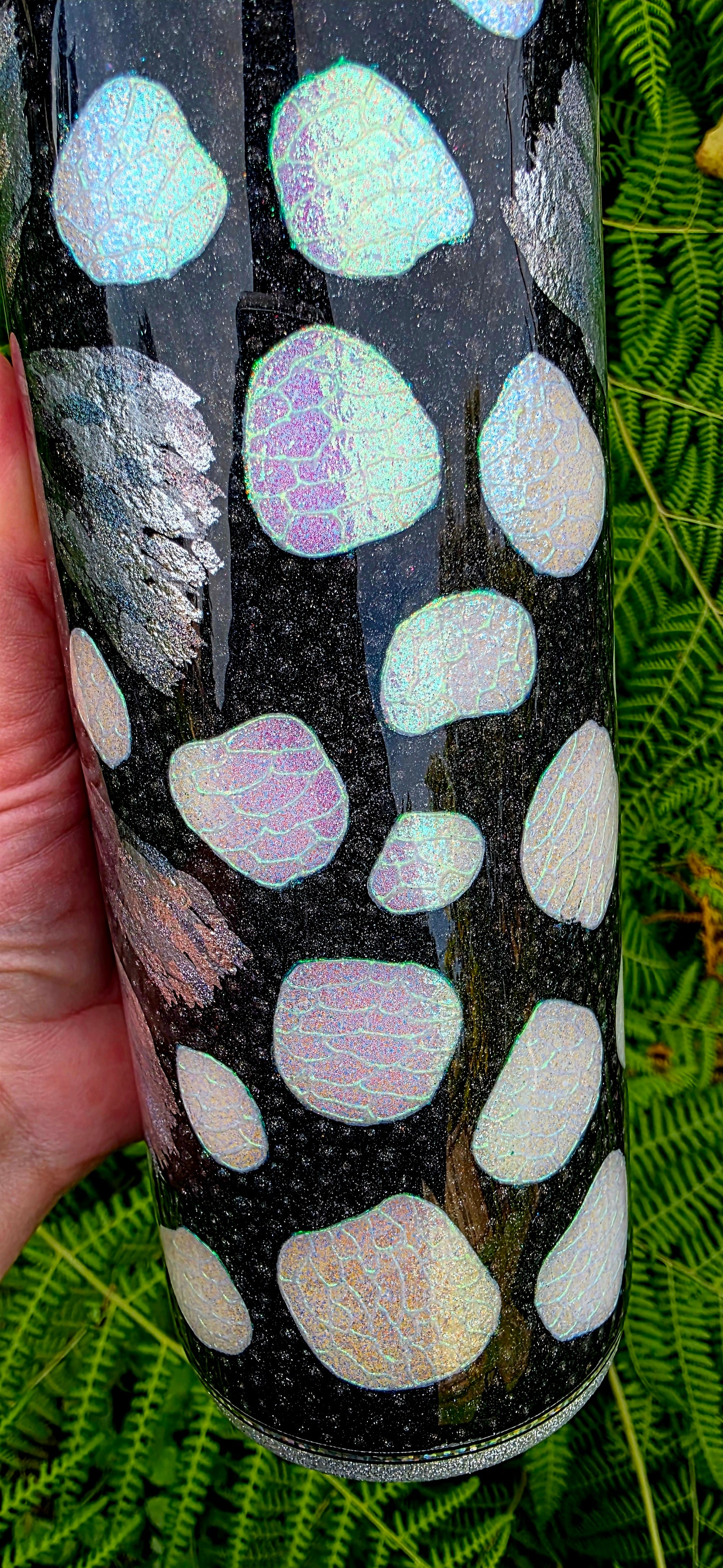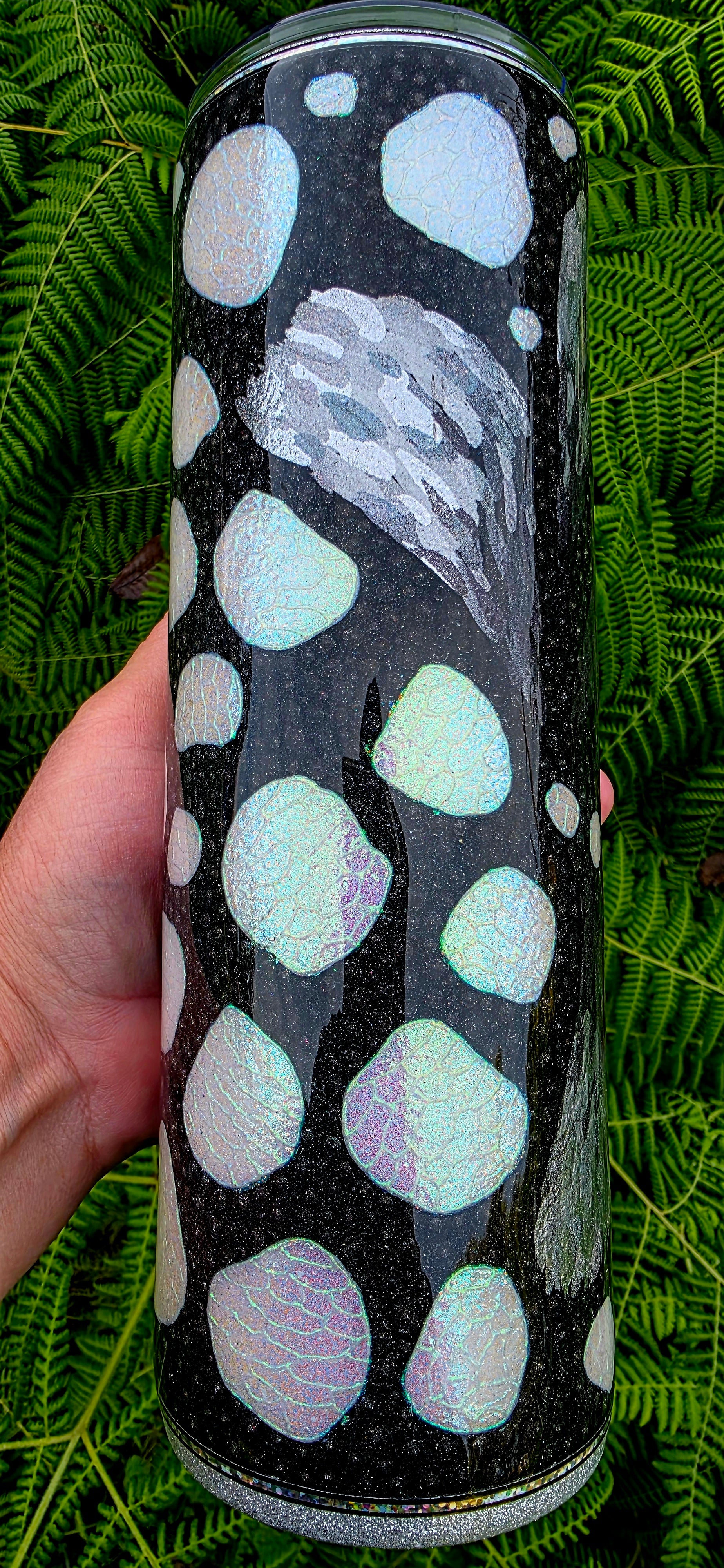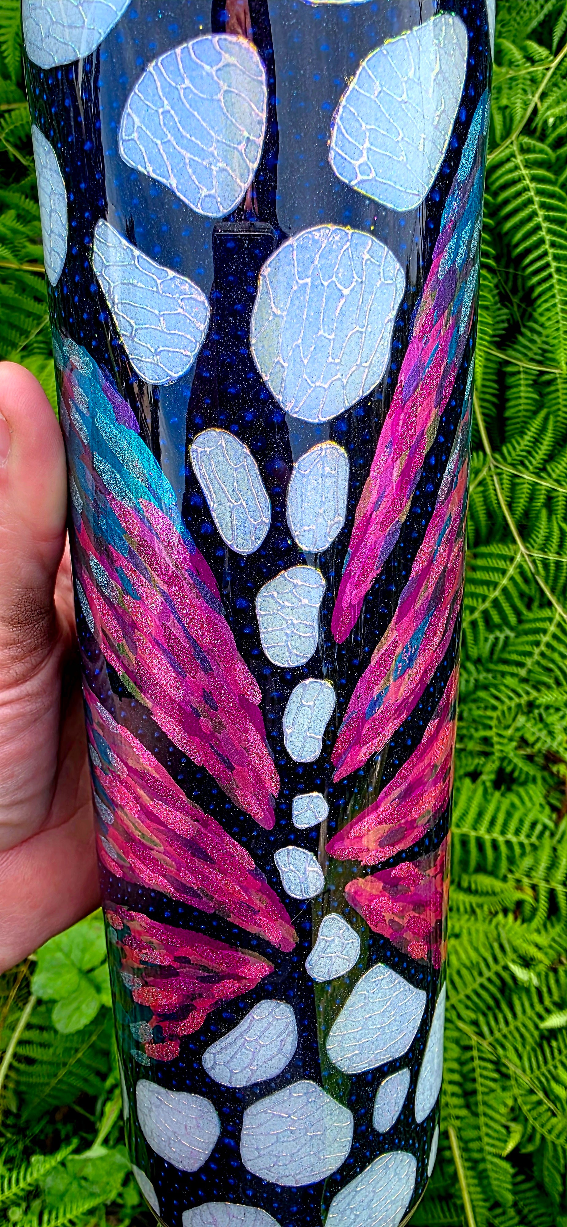 The signature white spots of the monarch are reinterpreted as well, crafted using white opal glitter for bright contrast. Each spot is detailed with a secondary opal pigment applied through glue in an organic, cell-like pattern that adds complexity and movement. The remaining black areas are dotted in black holographic glitter, giving the entire cup a subtle sparkle that shifts in the light.