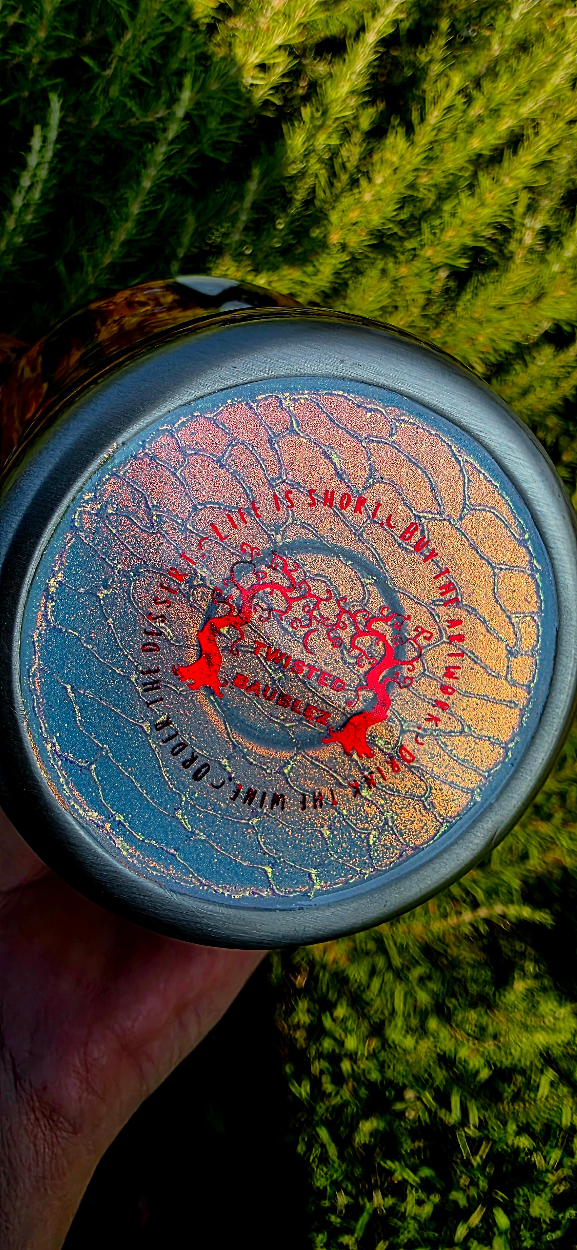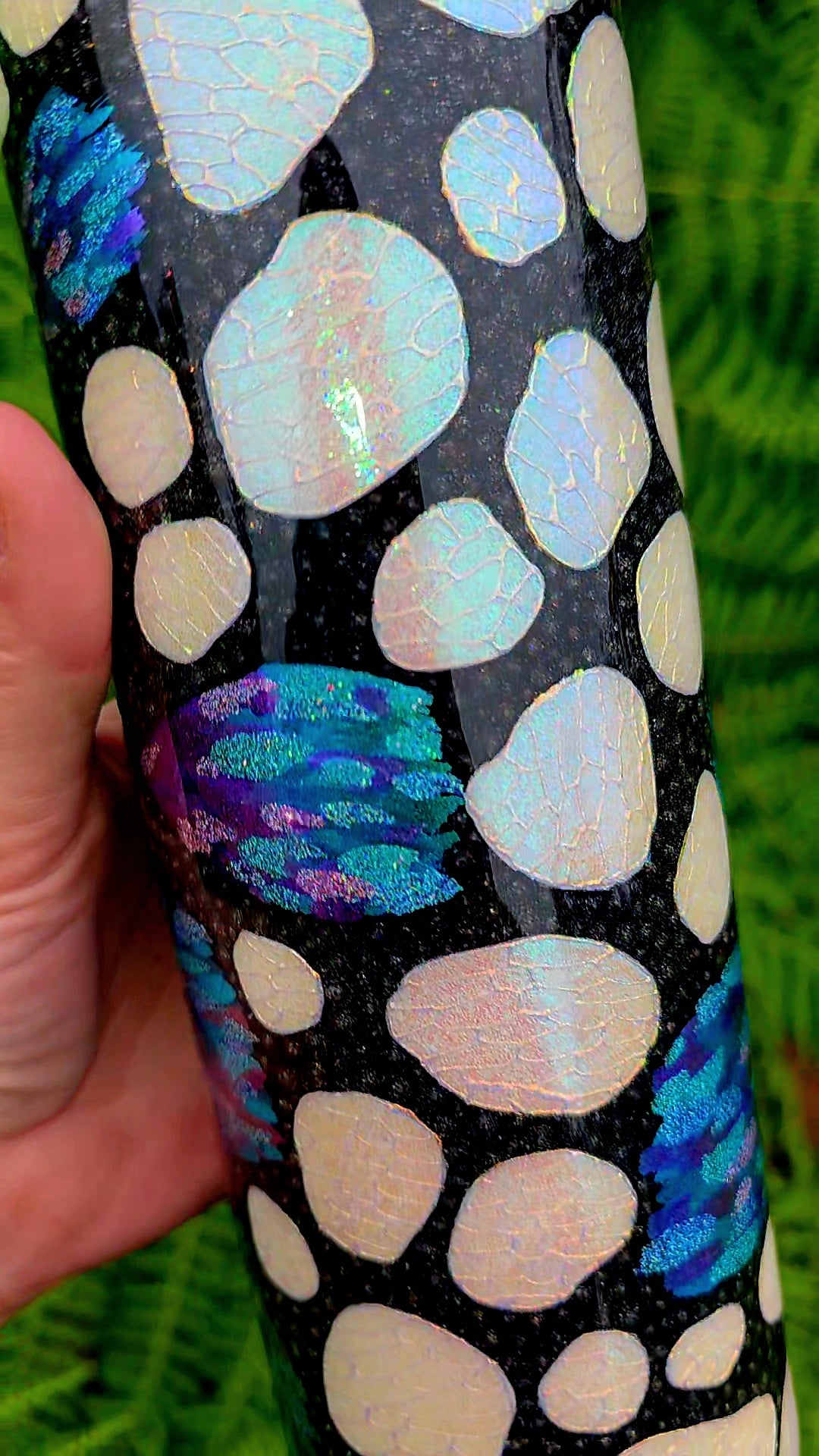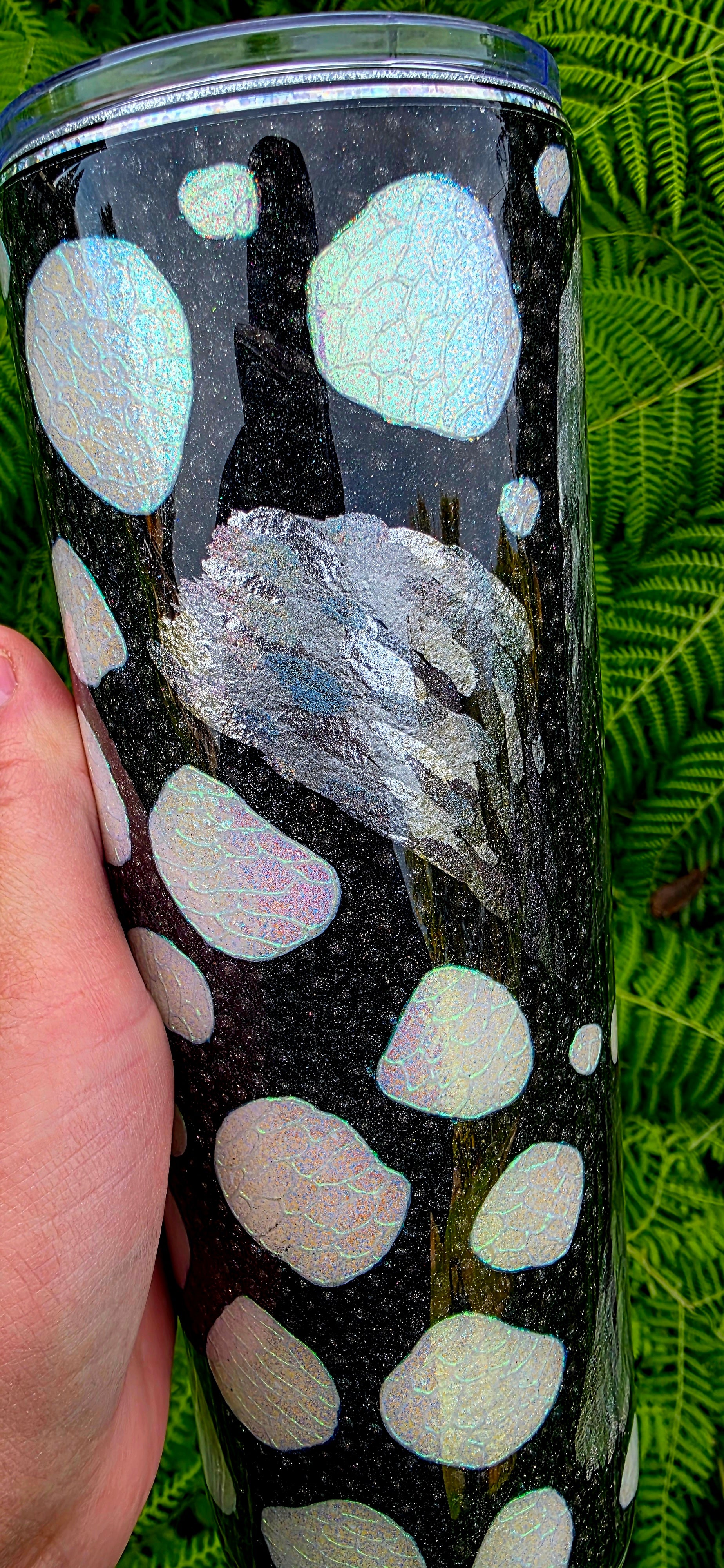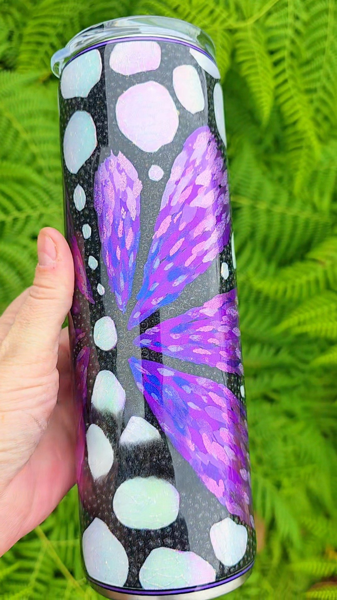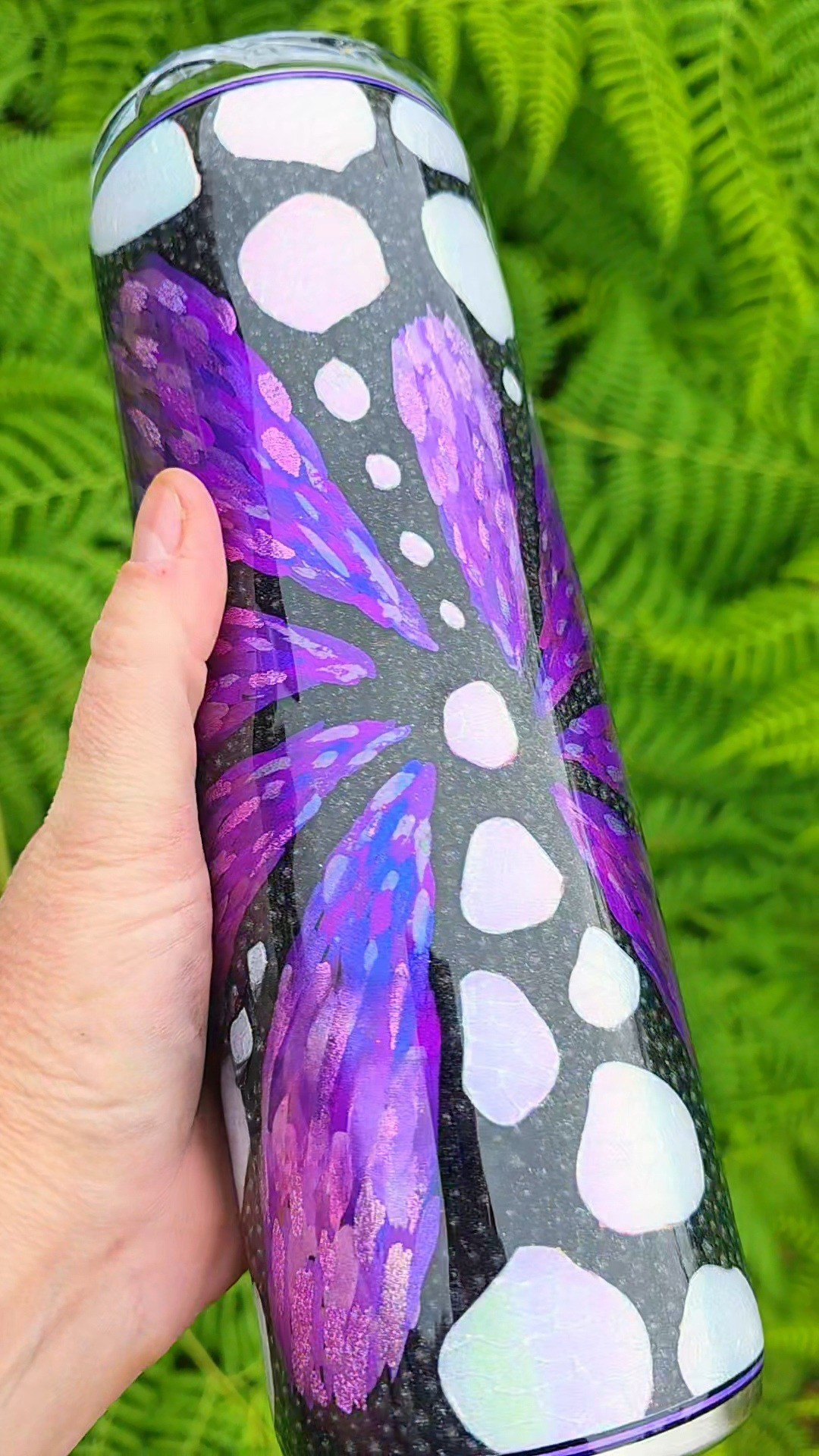 The signature white spots of the monarch are reinterpreted as well, crafted using white opal glitter for bright contrast. Each spot is detailed with a secondary opal pigment applied through glue in an organic, cell-like pattern that adds complexity and movement. The remaining black areas are dotted in black holographic glitter, giving the entire cup a subtle sparkle that shifts in the light.