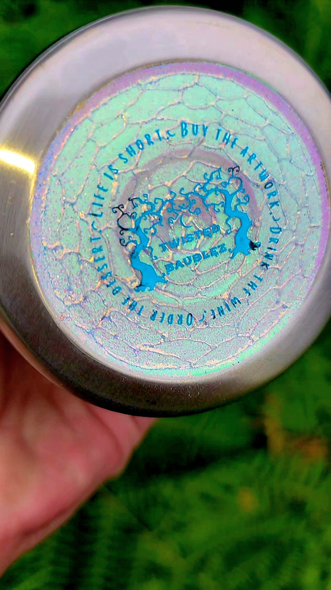 This striking design is built on a deep black base and inspired by the iconic monarch butterfly—reimagined through bold color, texture, and abstract pattern. Instead of depicting a literal butterfly, the cup features flowing, wing-like sections created in my Twisted Impressions style, using layered glue work, pigments, and glitter for rich texture and dimensional shine. Choose any color palette you’d like for these abstract “wing” sections, from soft pastels to vibrant jewel tones to dramatic neon blends.