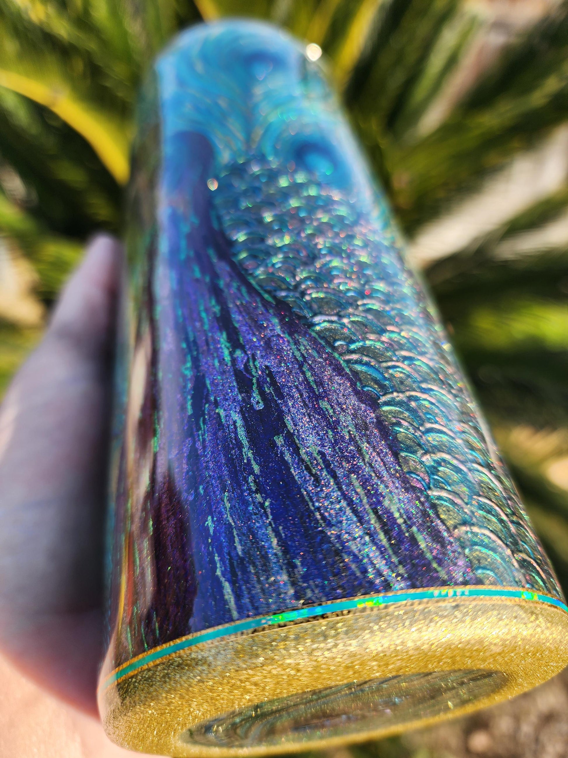 Every Peacock tumbler is one-of-a-kind, blending intricate sketchwork with luminous shine for a piece that feels both bold and refined.