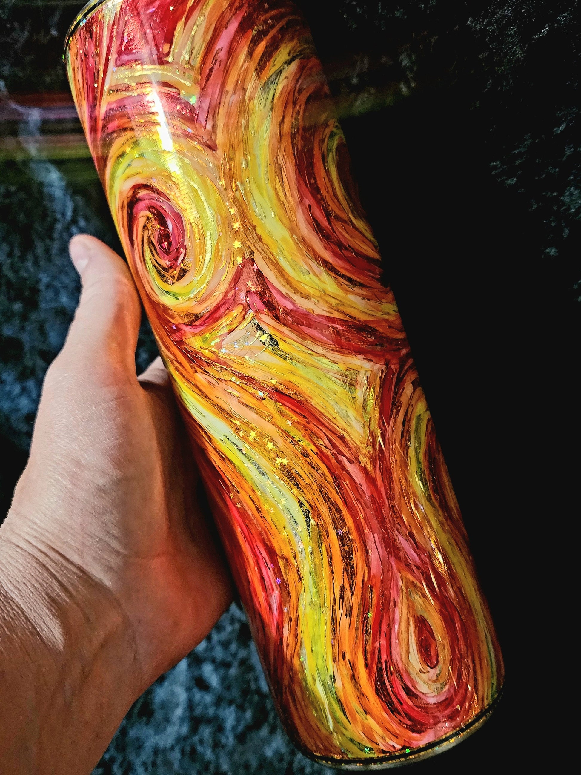 The Twisted Ink Swirl OG is one of my signature designs, inspired by post-impressionist artistry and alive with movement. Painted in alcohol inks over a holographic glitter or foil base, its swirling patterns echo the spirit of Van Gogh while remaining uniquely my own.